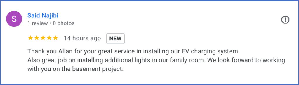 | 06/08/2024 | 5.0 | Review by Pri M. Project: Electric Vehicle Charging Station Installation – Residential – Materials Not Provided Comments: Allan was absolutely fantastic and accommodating – he did a great job installing the EV charger in our house. He is very knowledgeable and thorough and we would highly recommend him!! |