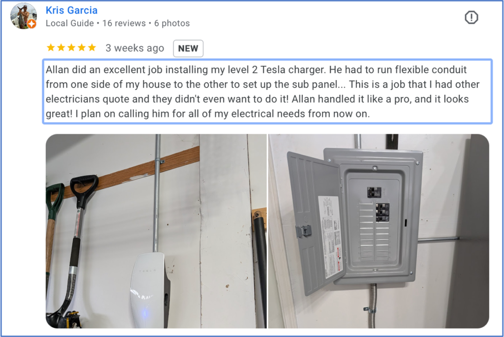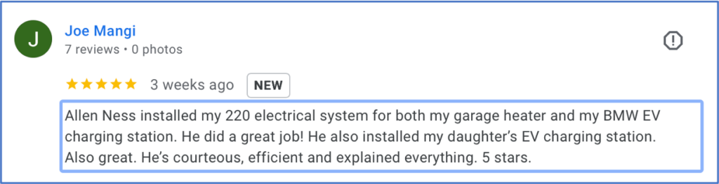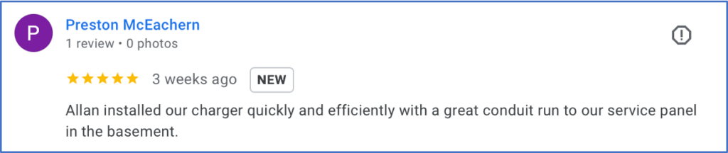 | 11/03/2023 | 5.0 | Review by Jeff O. Project: Electric Vehicle Charging Station Installation – Residential – Materials Not Provided Comments: Allan was great. He has clearly been specializing in these installations and it showed. The installation was done very cleanly meeting all the requirements we had. The estimate and final cost was spot on so that was very nice as well. Highly recommend Allan. Ask him about his pups… it was a great conversation as part of the work. Thanks Allan! |
