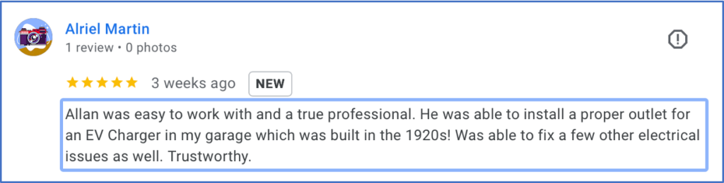 | 12/16/2024 | 5.0 | Review by Nicholas B. Project: Electric Vehicle Charging Station Installation – Residential – Materials Not Provided Comments: Allan was fantastic to work with! He was very professional and knowledgeable from the initial phone call to the end of the project. The installation of my 220v outlet and electric vehicle charger went smoothly and was completed ahead of the estimate. The final cost was even lower than the original quote, which was a pleasant surprise. While there was a minor oversight with some debris left behind after the job, it was easily cleaned up and did not detract from the overall excellent service. I would highly recommend Allan for your next 220v outlet install. |