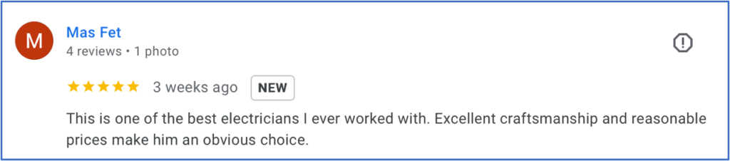 | 4/07/2026 | 5.0 | Review by Eitan S. An unusually excellent, bright, fair, responsive, and experienced electrician. I recommend Alan wholeheartedly. |